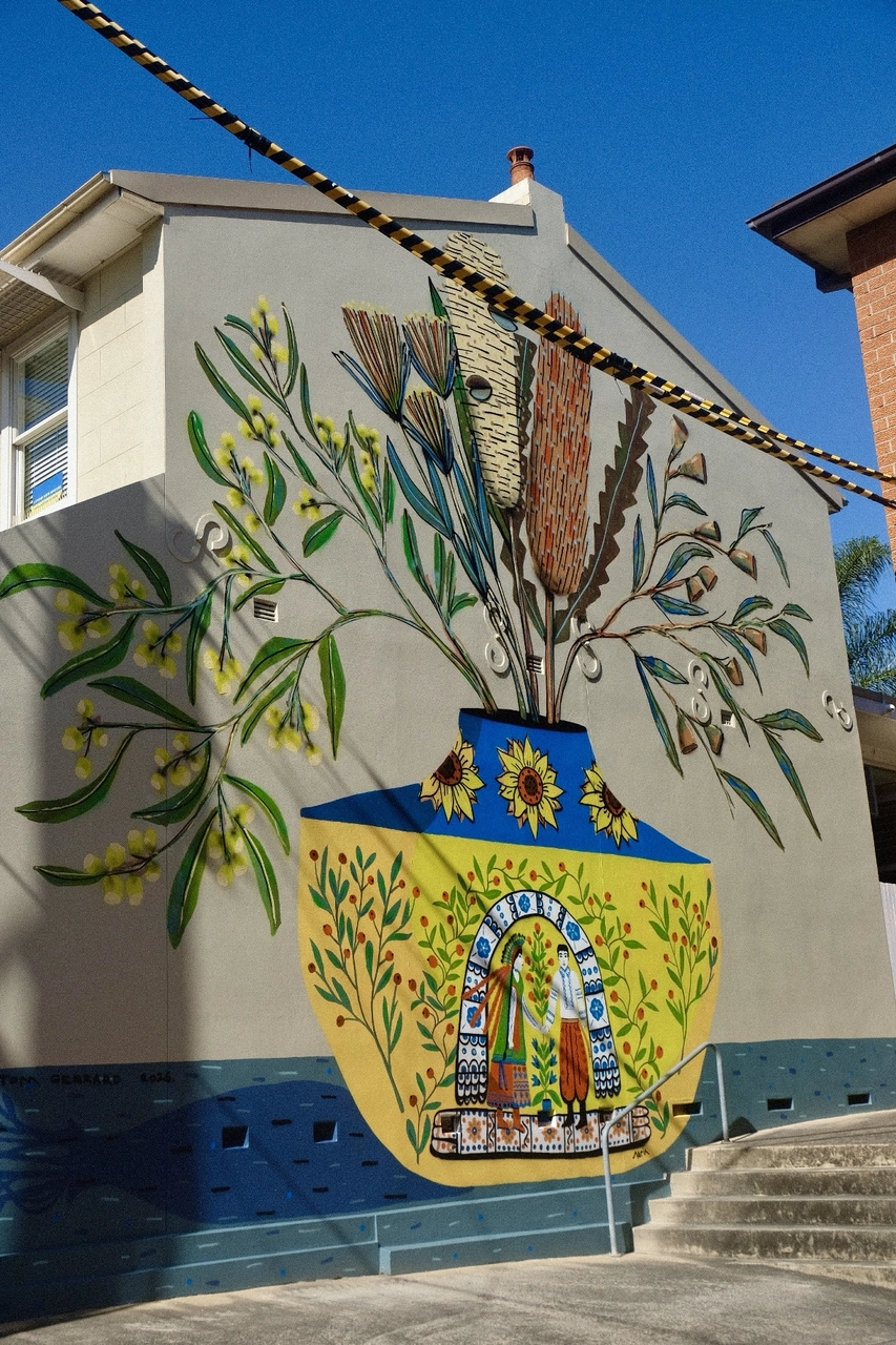 In a collaboration with Inner West Council, the local municipal administration, international artist Tom Gerrard, and local homeowner and proud Ukrainian Australian, Daniel Harasymiw, the once-bare side wall of Daniel’s home has been transformed over a week into a stunning mural. The new mural fuses two themes: the folkloric and fantastical work of famous Ukrainian artist, Maria Prymachenko, and Australia’s unique native flora, such as gum nuts, wattles, waratahs and bottle-brushes.